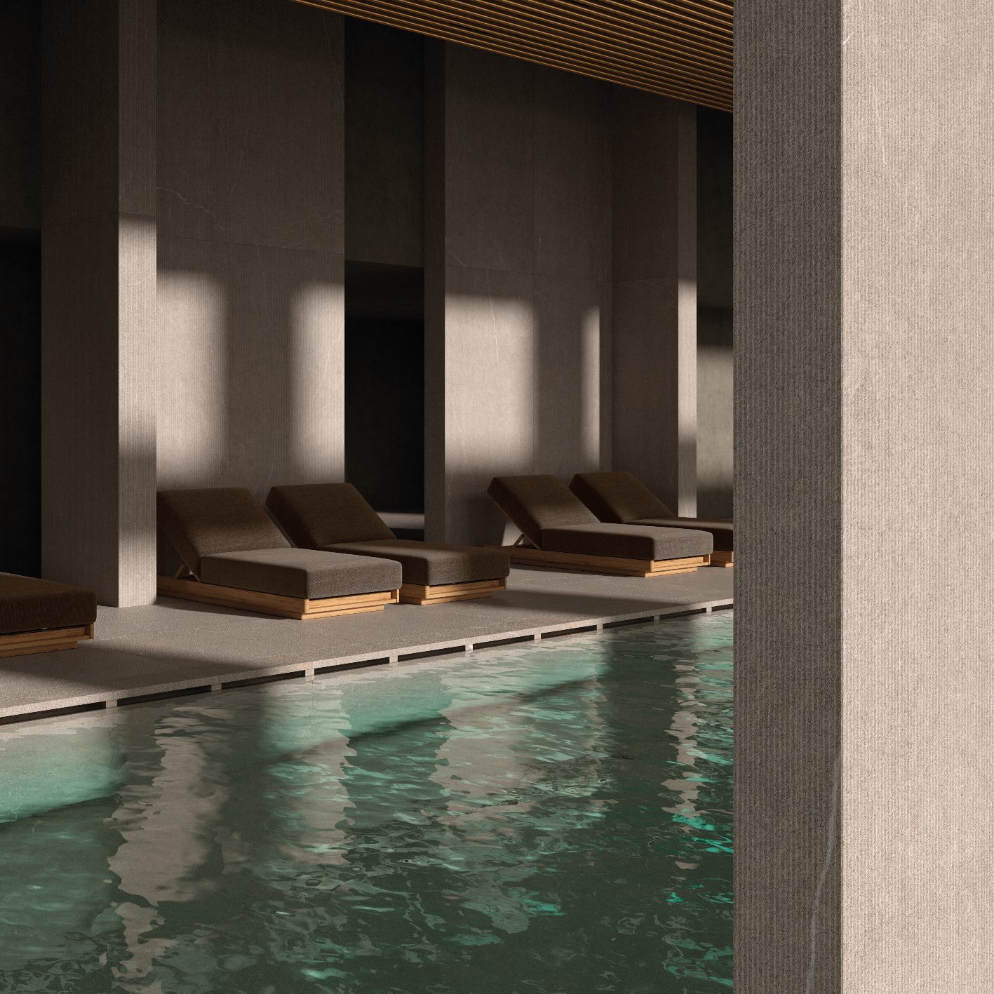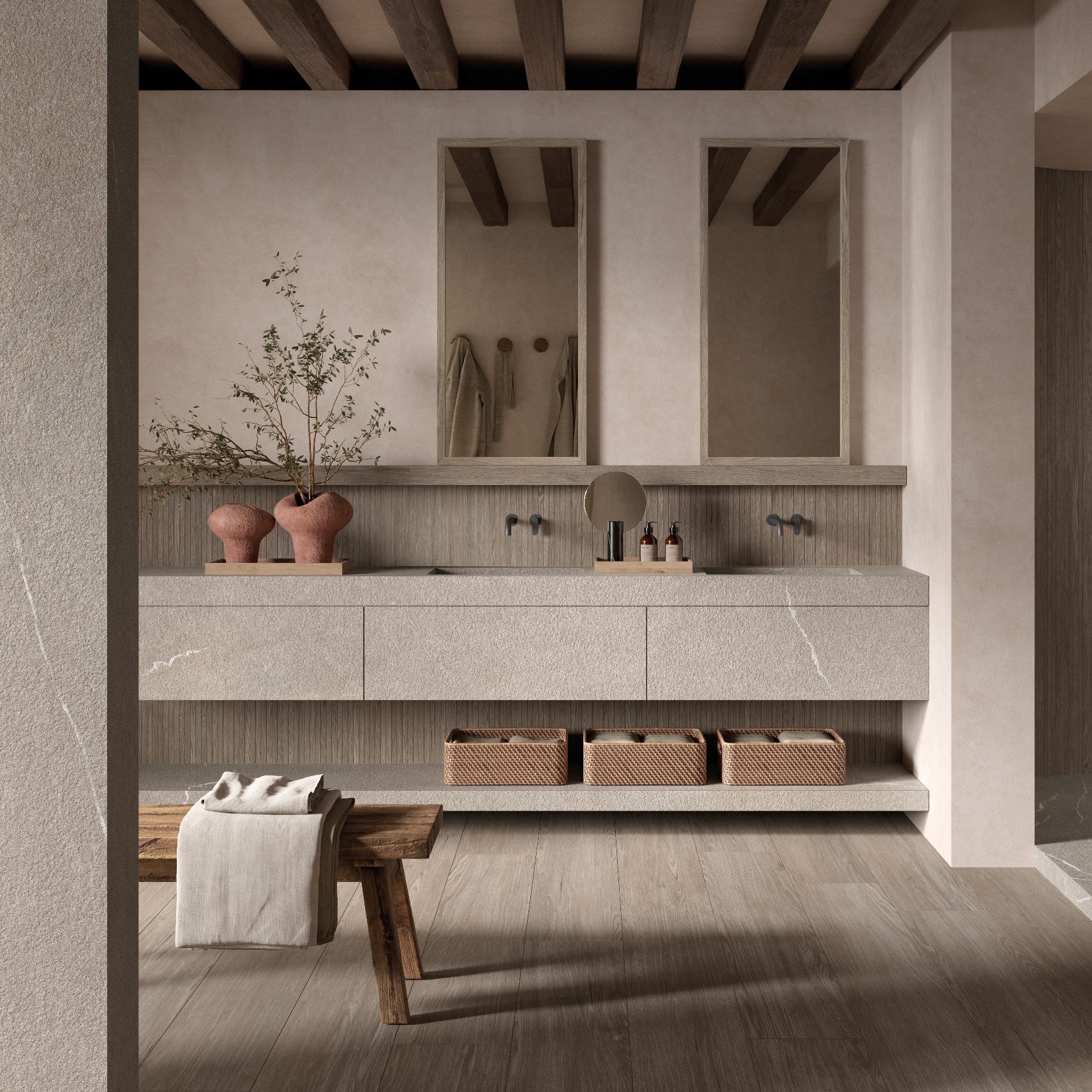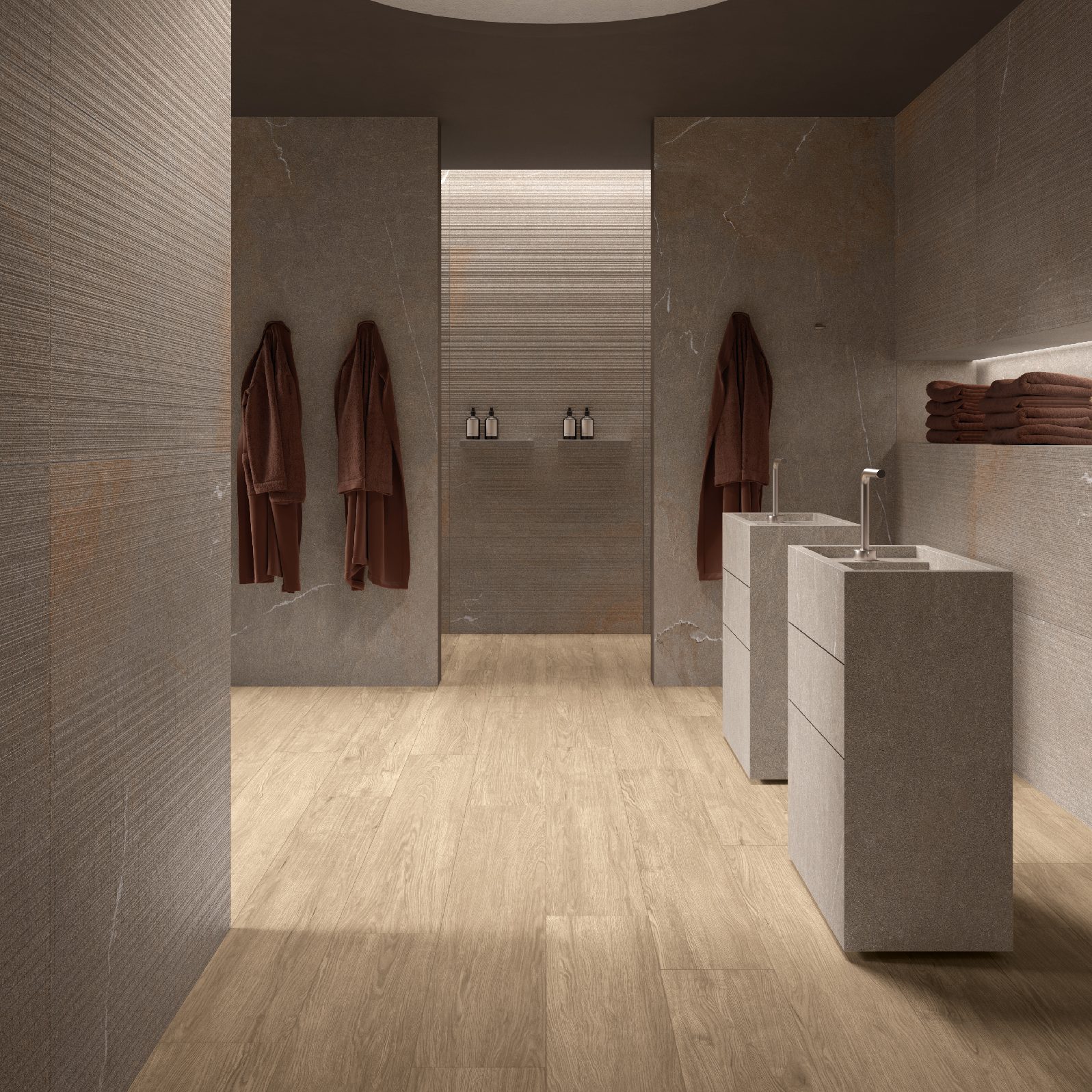 Modelet autentike të venave të gurit Piasentina kombinohen me ngrohtësinë e drurit për të krijuar hapësira që frymëzojnë qetësi dhe rigjenerim, me një humor paqeje dhe mirëqenie të thellë. Çdo veçori është zgjedhur për të ofruar një përvojë të plotë shqisore, ku mirëqenia arrihet përmes zhytjes në një mjedis që pasqyron bukurinë dhe qetësinë e natyrës.